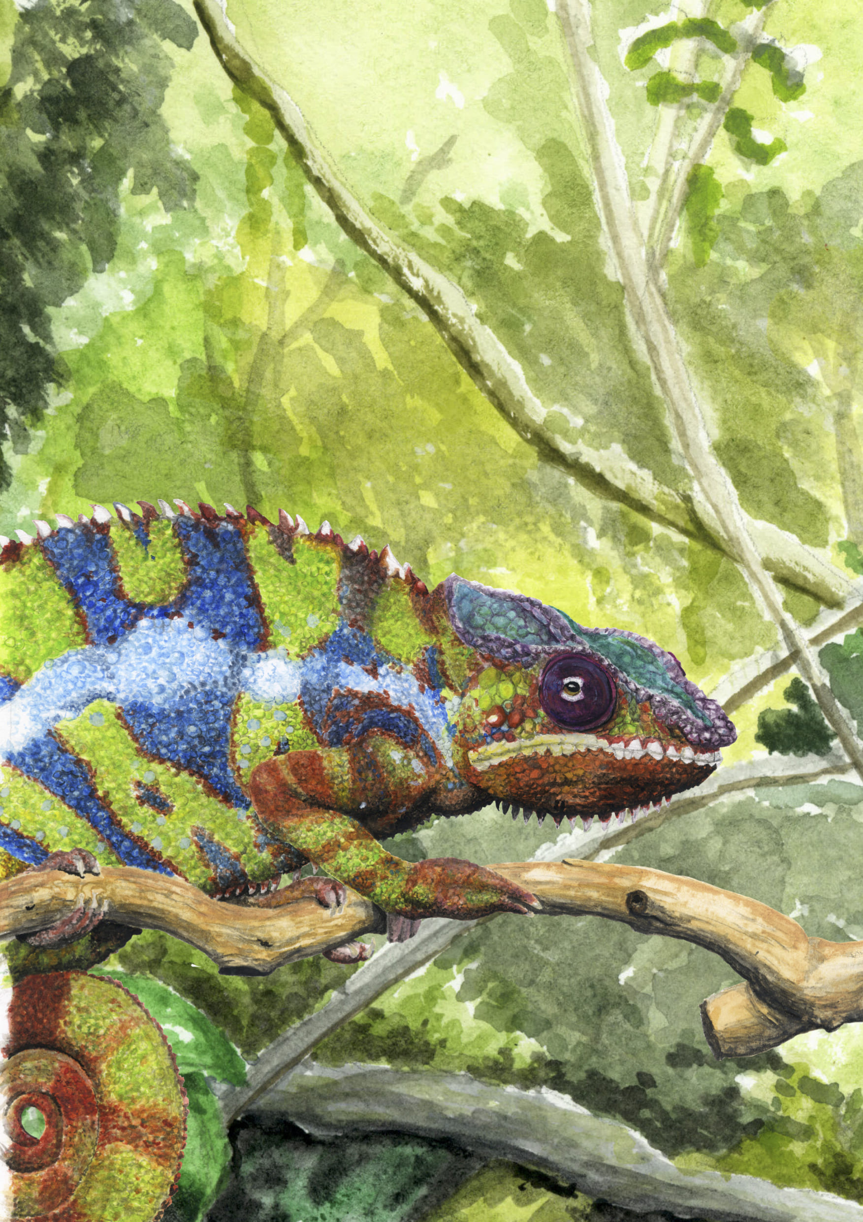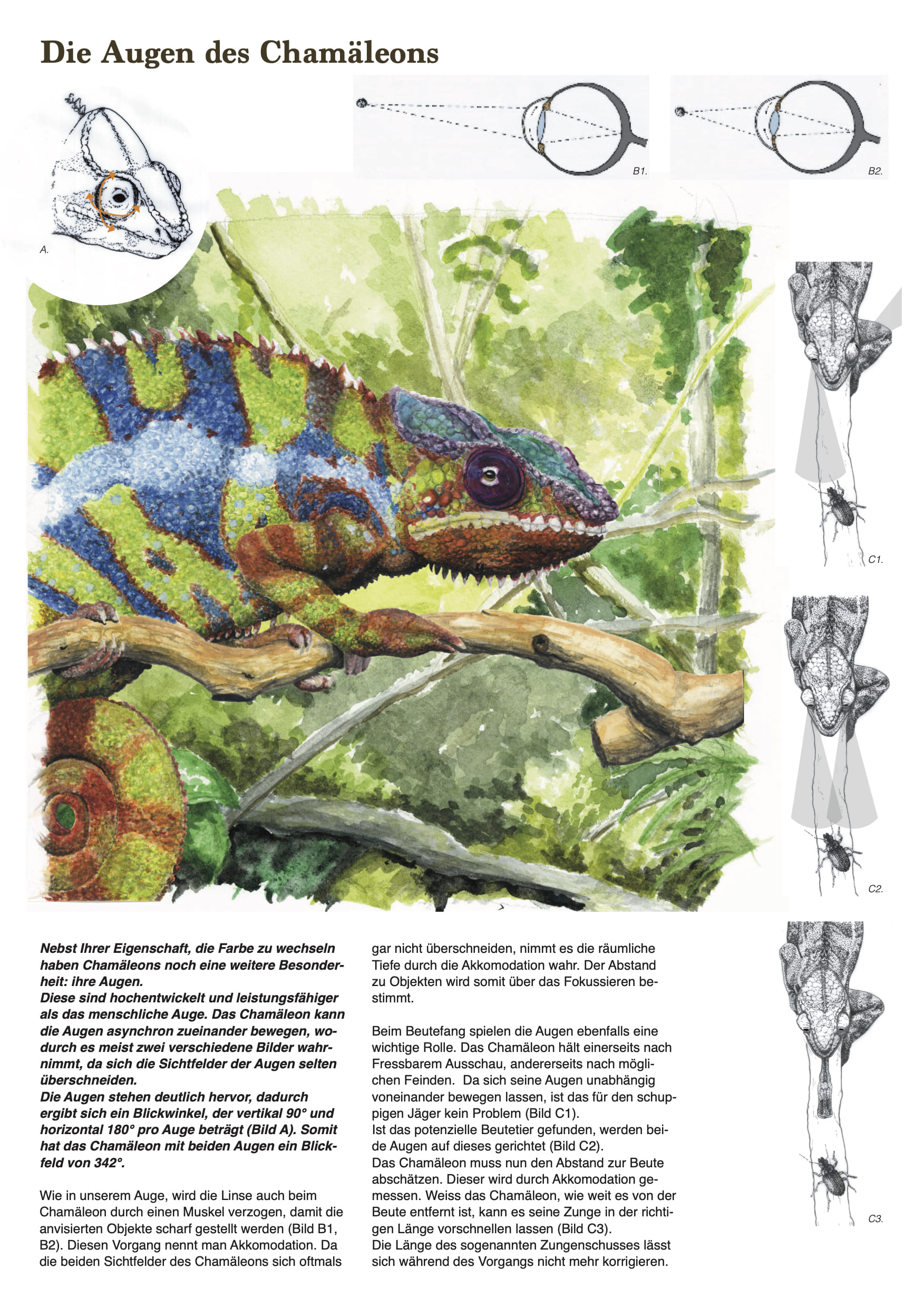 Um für den Studiengang Scientific Visualization an der ZHdK aufgenommen zu werden, sollte man eine Arbeit zum Stichwort “Asynchron” gestalten. Nach einiger Recherche entschied ich mich, eine Arbeit zum Chamäleon zu machen, das seine Augen asynchron zueinander bewegen kann. Durch Skizzen im Zoo, dem schielendem Reptil näher gekommen, machte ich mich an die Arbeit eine Infografik zu den Geheimnissen seines Silberblicks zu erstellen. Gezeichnet und gemalt ist die ganze Arbeit analog und in Indesign passend zusammengefügt und beschriftet.
