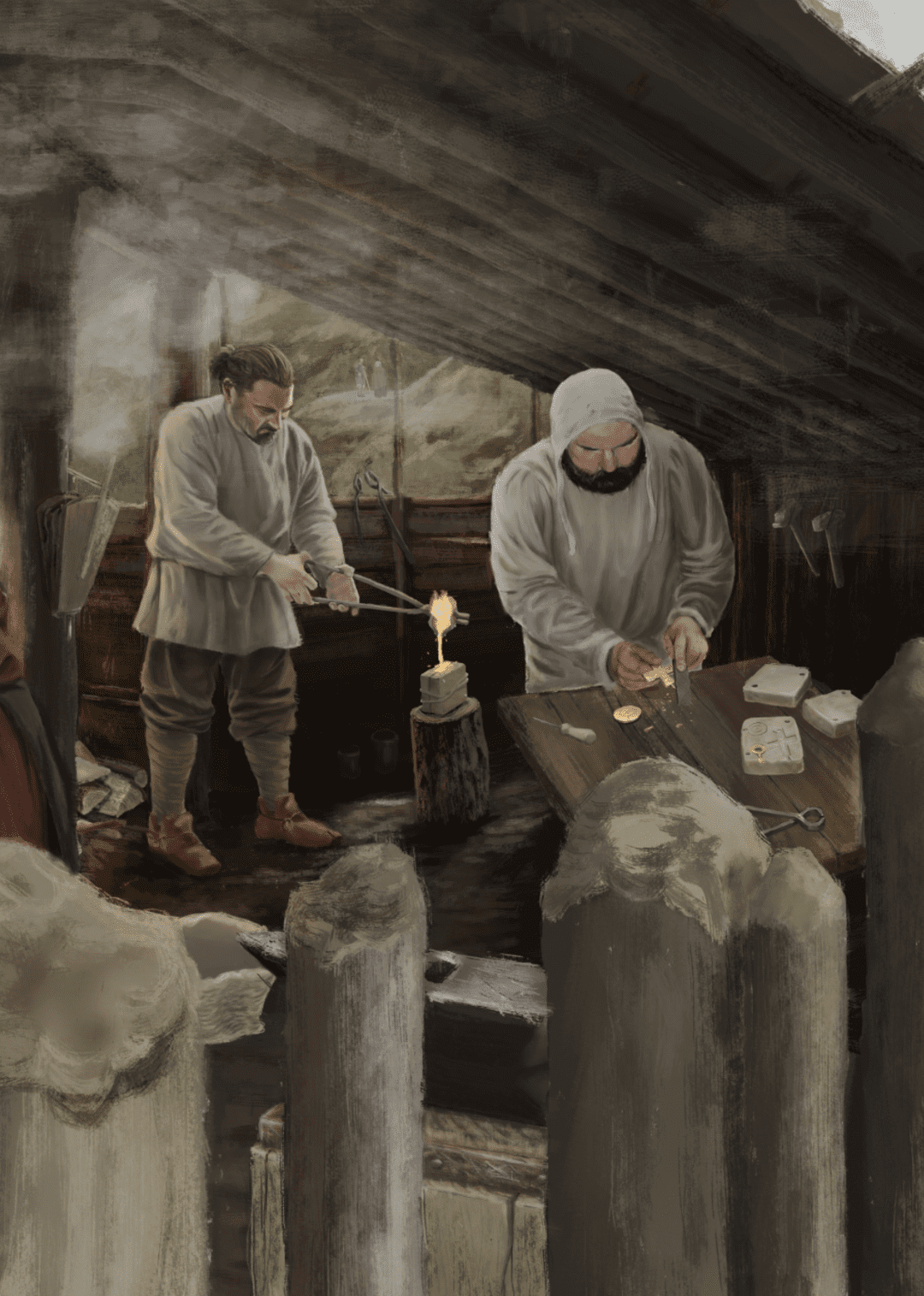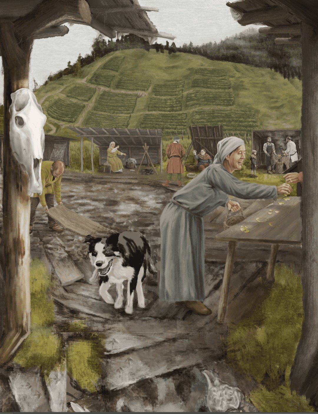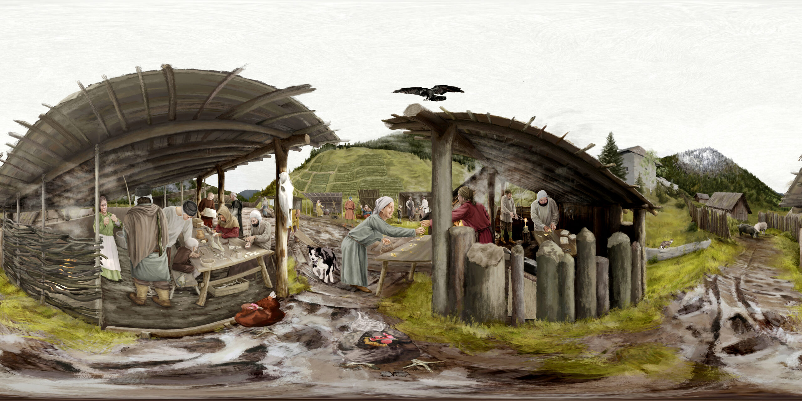 In Kooperation mit der Kantonsarchäologie Graubünden durfte ich meine Bachelorarbeit über das kürzlich ausgegrabene Handwerksquartier in Chur machen. In einer Ausstellung über den mittelalterlichen Handel zwischen den Alpen und dem Bodenseeraum sollte es ermöglicht werden, sich ein Bild der verschiedenen nachgewiesenen Handwerke zu machen. Man entschied sich für die Ausführung eines Kugelbilds, um diese Ziele zu erreichen. Das Kugelbild oder 360°-Panorama erlaubt es, mit Hilfenahme einer VR-Brille sich in andere Zeiten und Räume zu begeben. Das Bild selbst ist zweidimensional in Photoshop gezeichnet und wurde am Computer so verzerrt, dass es in die virtuelle Kugel passt. Für einmal muss dass Eckige in das Runde, wenn auch weit weg vom sportlichen Kontext.