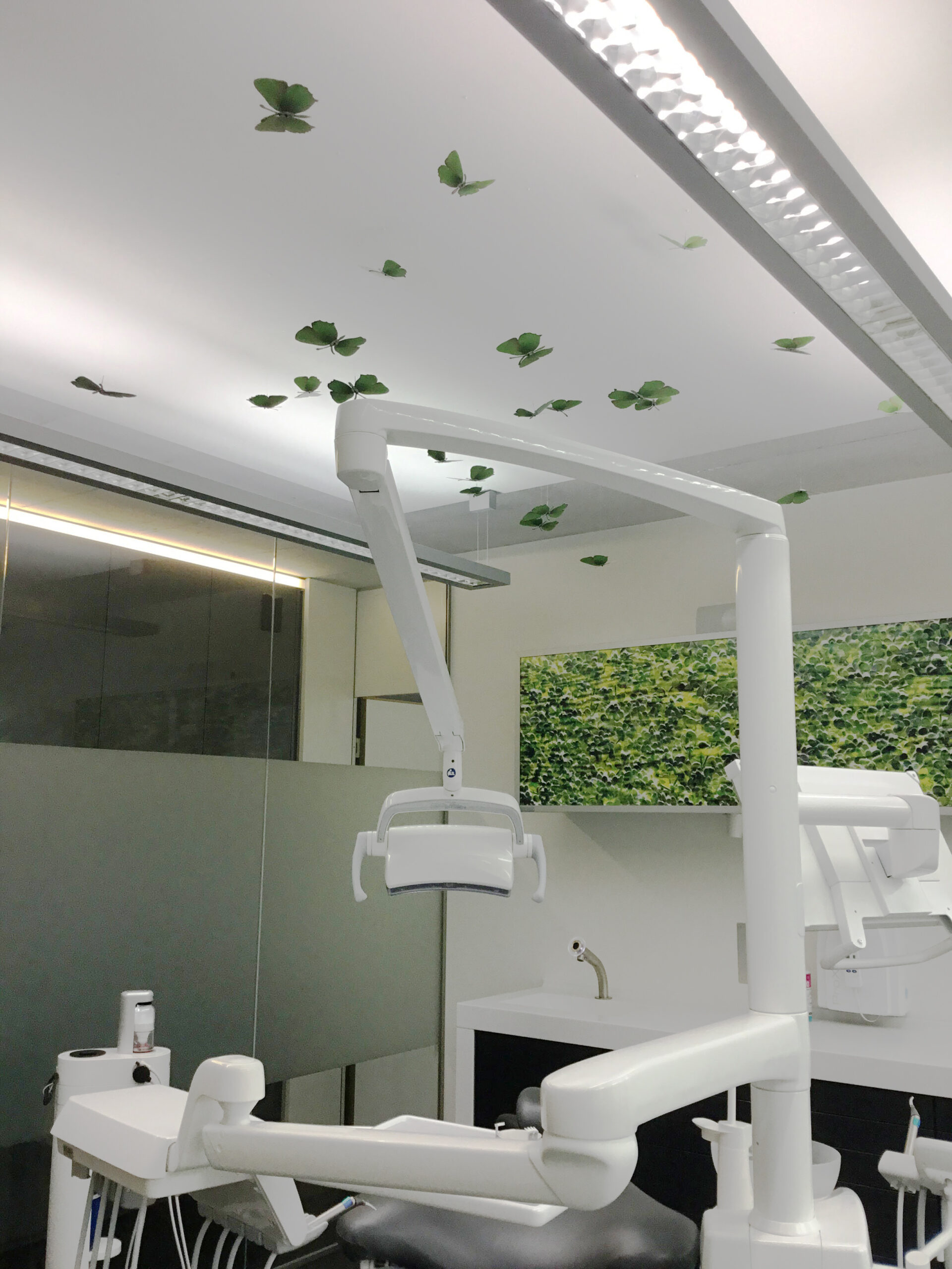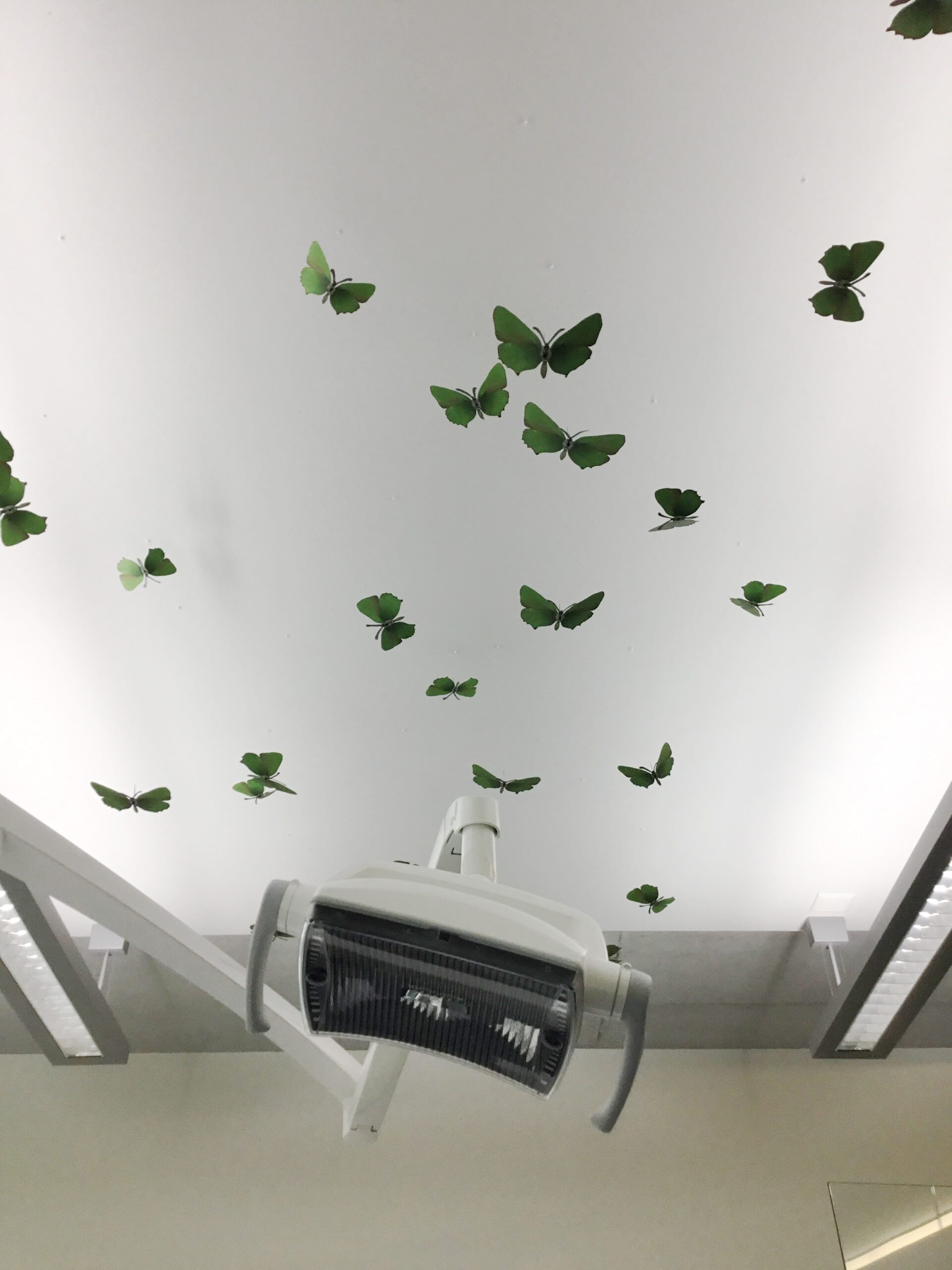 Die meisten Leute brechen nicht gerade in euphorische Begeisterungsstürme aus, wenn die alljährliche Zahnkontrolle ansteht. Sind die Zahnärzte und Ärztinnen noch so nett, so richtig gerne geht niemand hin. Sobald man dann mit offenem Mund in der Horizontalen liegt, sind die Ablenkungsmöglichkeiten, dann auch minimal; Decke, Lampe oder Zahnmediziner mit Instrumenten in der Hand. Dann lieber Augen zu. Um die Patienten und Patientinnen abzulenken und auch zu beruhigen, hat sich die Zahnarztpraxis Gleis 10 etwas einfallen lassen. Durch ein Mobile aus vielen einzelnen, heruntergehängten Schmetterlingen wird die Stimmung im Behandlungszimmer sehr viel angenehmer. Die Schmetterlingen wurden von mir mit Procreate gezeichnet und als fertige Druckdatei übermittelt.